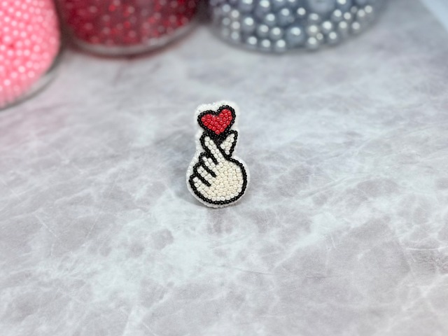ビーズ刺繍ピンバッジ/きゅんです❤️ 指ハートをモチーフにした、ビーズ刺繍の可愛いピンバッジです。 つぶらなハートと、ぷっくりとした手のシルエットが愛らしく、バッグや帽子、洋服のワンポイントにぴったり✨ ひとつ持っているだけで、気分が「きゅん❤️」とあがるアイテムです。 一つひとつ手刺繍で仕上げており、ビーズの立体感が存在感を引き立てます。 ⸻ ■サイズ: 縦 約5cm × 横 約3cm ■素材: ・ビーズ ・合皮(裏面) ・金属製ピン(金具) ■注意点: ・一点ずつ手作業で制作しているため、個体差があります。 ・デリケートな作りのため、無理な力を加えずご使用ください。 ⸻ プレゼントにもおすすめ! ちょっとした「推し活」や「オシャレのアクセント」にどうぞ♪