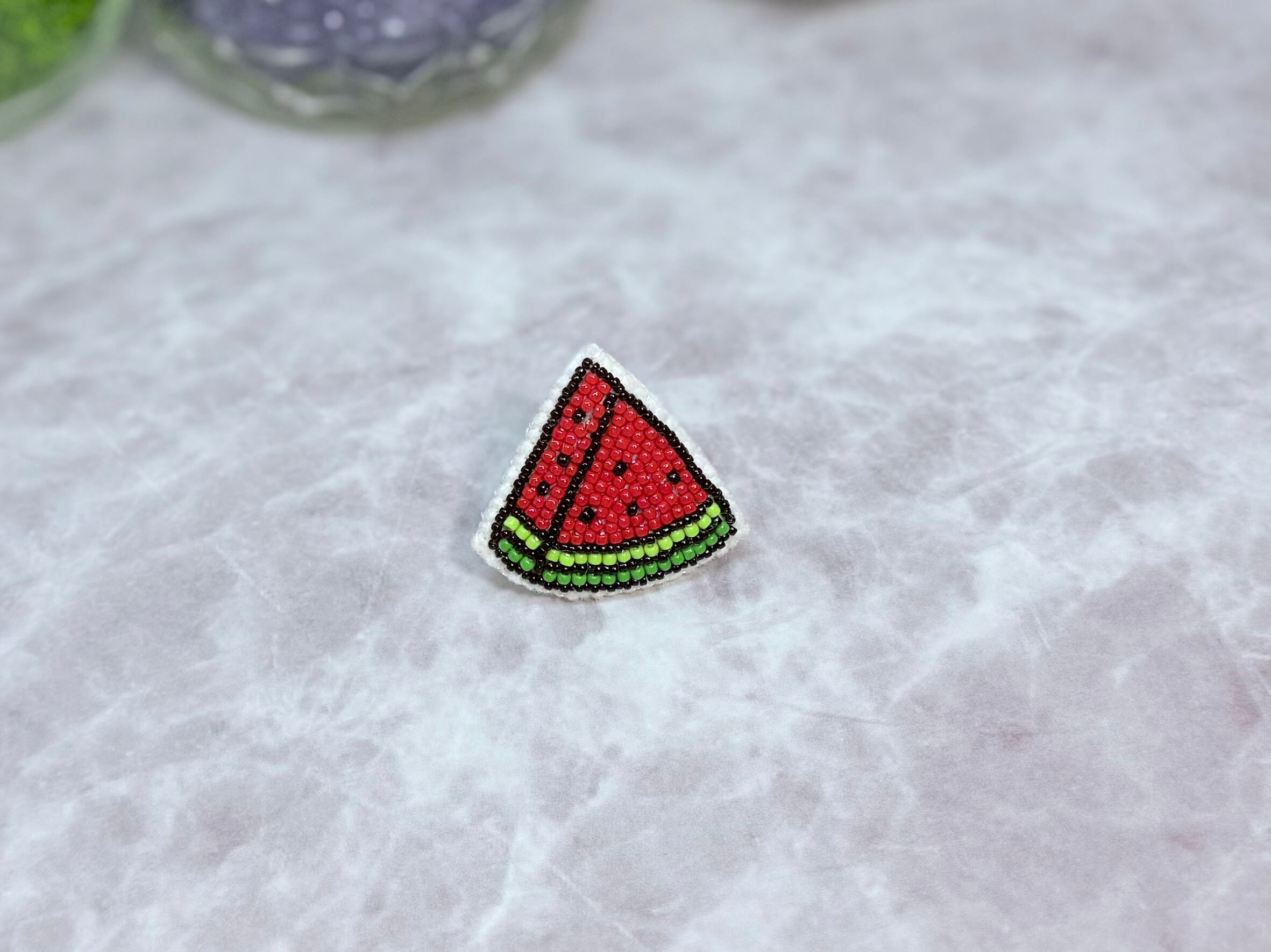 夏の定番フルーツ・スイカを、鮮やかなビーズで表現したピンバッジです。