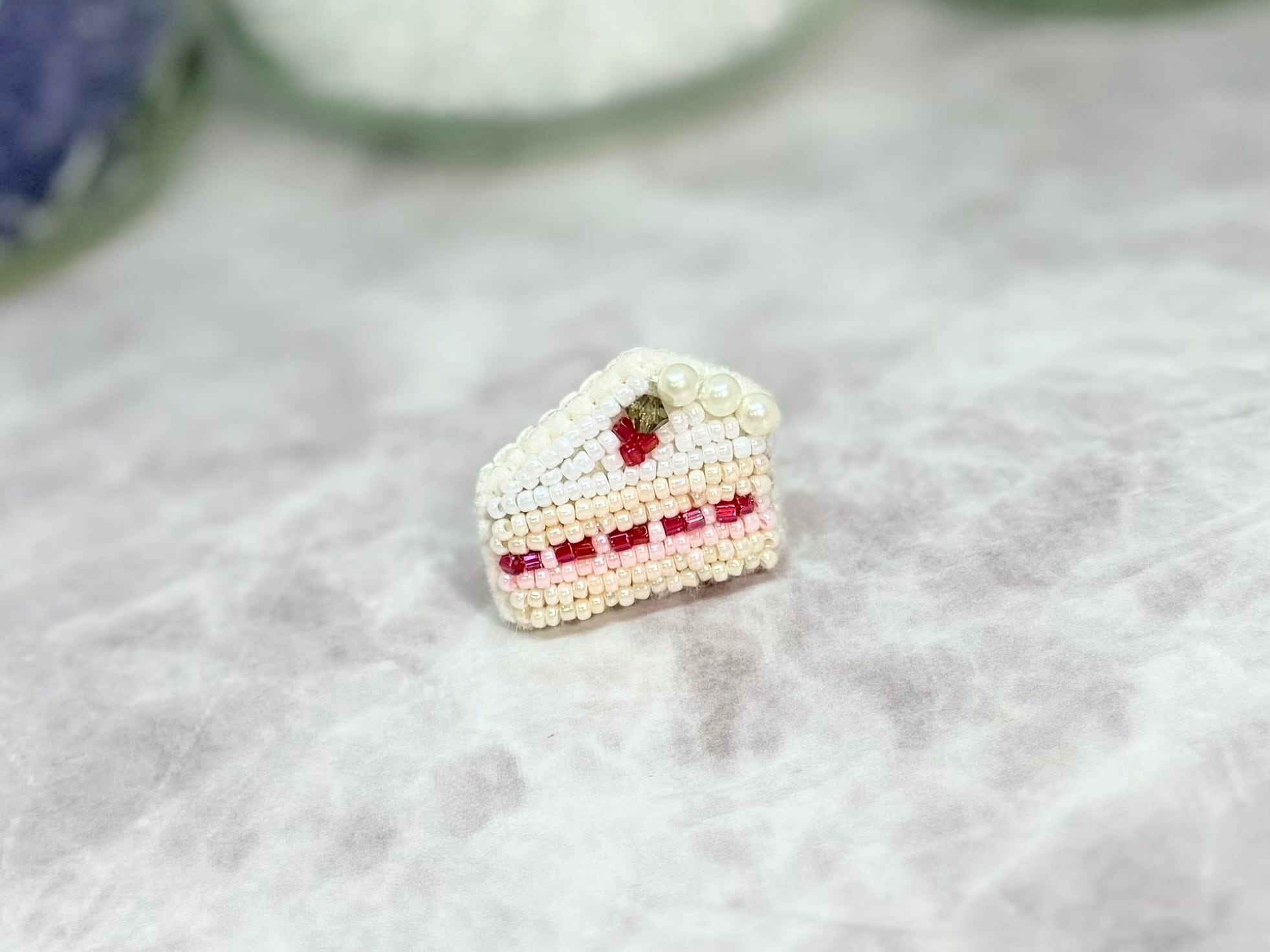 ホワイトとピンクのビーズでクリームとスポンジを表現し、トップにはパールと赤いビーズでイチゴをあしらいました。小ぶりながらも存在感があり、身につけるだけでコーデに可愛らしさをプラスします。