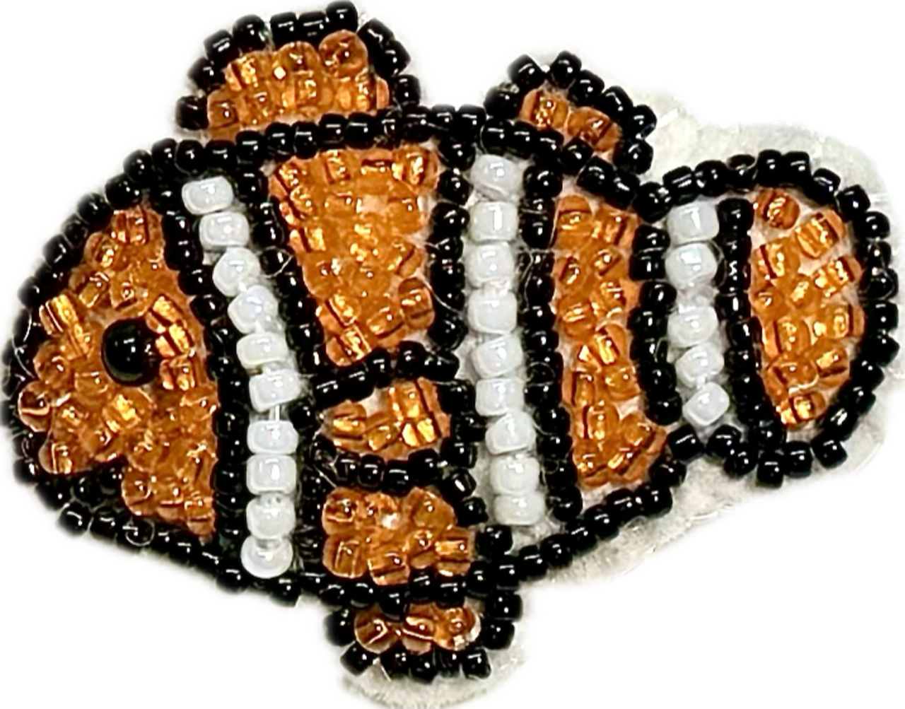 鮮やかなオレンジと白のストライプ模様が特徴の「クマノミ」をモチーフにしたビーズ刺繍ピンバッジです。小ぶりながらも存在感があり、遊び心のあるアクセントとして幅広いシーンで活躍します。