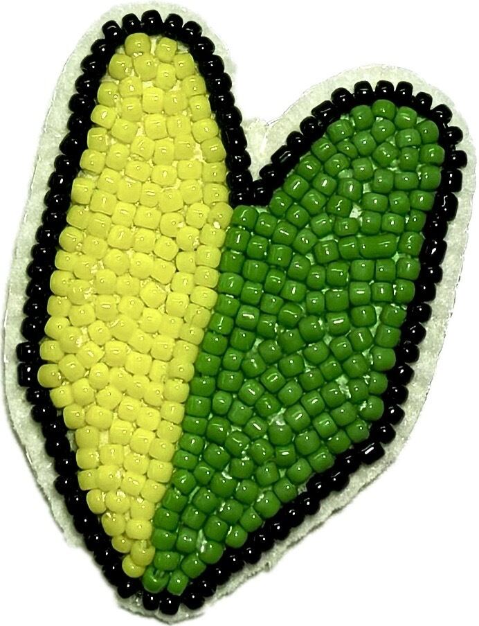 やさしい配色とつややかなビーズが印象的な「初心者マーク」モチーフのビーズ刺繍ブローチです。