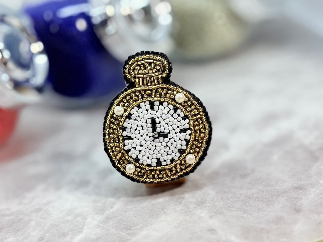 ビーズ刺繍で丁寧に仕上げられた「懐中時計ブローチ」は、ゴールドのビーズとパールビーズを巧みに組み合わせた、時を超えた魅力を感じさせる個性的なアイテムです!日常のファッションにクラシックなアクセントを加え、周囲の視線を惹きつけること間違いありません。これを身につけることで、コーディネートが一層華やかで魅力的になることでしょう。